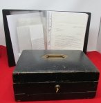 Original era manufacture. Black leather covered wooden folding desk, with gilt naming on the lid to Colin J.L. Halkett, 73rd Perthshire Regt, below the recessed brass carrying handle. The desk measures 12 x 9 x 4.5 inches when closed; open, it measures 12 x 19.5 x 3 inches. The interior displays several compartments for papers and envelopes, with two original inkwells and two bone-handled mechanical lead pencils.The desk is in overall very sound condition for its age, displaying wear to the leather surfaces near the hinge and bottom edge. Colin James Love Halkett 1858-1880, was commissioned into the 73rd Perthshire Regiment in 1879; joining the regiment then stationed in India in March of 1880.He, along with five other members of the 73rd, were killed in a landslide on the 18th of September 1880; while engaged in a working party attempting to rescue others buried in a previous landslide at Naini Tal India. Their bodies, and those of the earlier victims, were never recovered.The 73rd Perthshire Regiment of Foot was raised in 1780, joining with the 42nd Foot in 1881 to become the Black Watch. In January 1852, a detachment of the 73rd (73 men) were enroute from Simon's Town to Port Elizabeth aboard the troopship HMS Birkenhead, when the Birkenhead struck rocks near Danger Point. The men were assembled on the deck of the sinking transport, remaining calm while the women and children were allowed to enter the lifeboats. Ordered not to swim to the boats for fear of upsetting the boatsinto the water and endangering the civilian passengers; the troops stood fast as the waters closed around them. Over 357 officers and men drowned during the incident. Comes with an extensive research file on Lieutenant Halkett and the incident at Naini Tal.