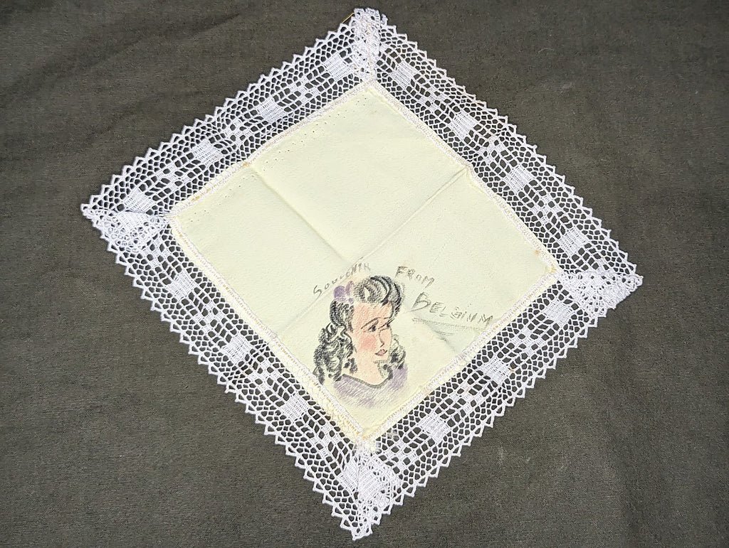 Small decorative souvenir handkerchief from Belgium. In good condition. There are some small holes along one edge of the yellow fabric. I believe the yellow is some kind of recycled material and these holes are from previous stitching. Small brown specks on the lace.