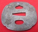 Original era manufacture. Japanese sword Tsuba, iron constructionwith a cherry blossom motif on each side. It appears to have been cleaned, even matt gray patina surface.