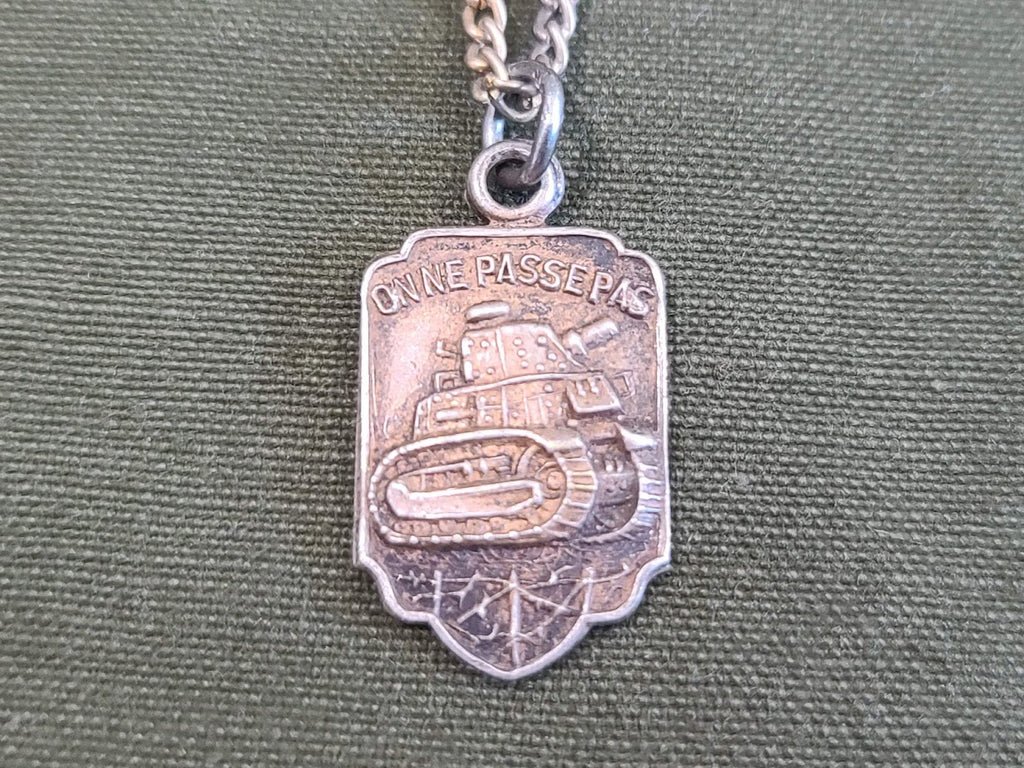 Vintage WWI French sweetheart necklace with tank. 'On ne Passe pas' (they shall not pass) was first used in the battle of Verdun in 1916 and was later used by troops defending the Maginot Line. It is unmarked. There is some discoloration patina on both the charm and the chain.
