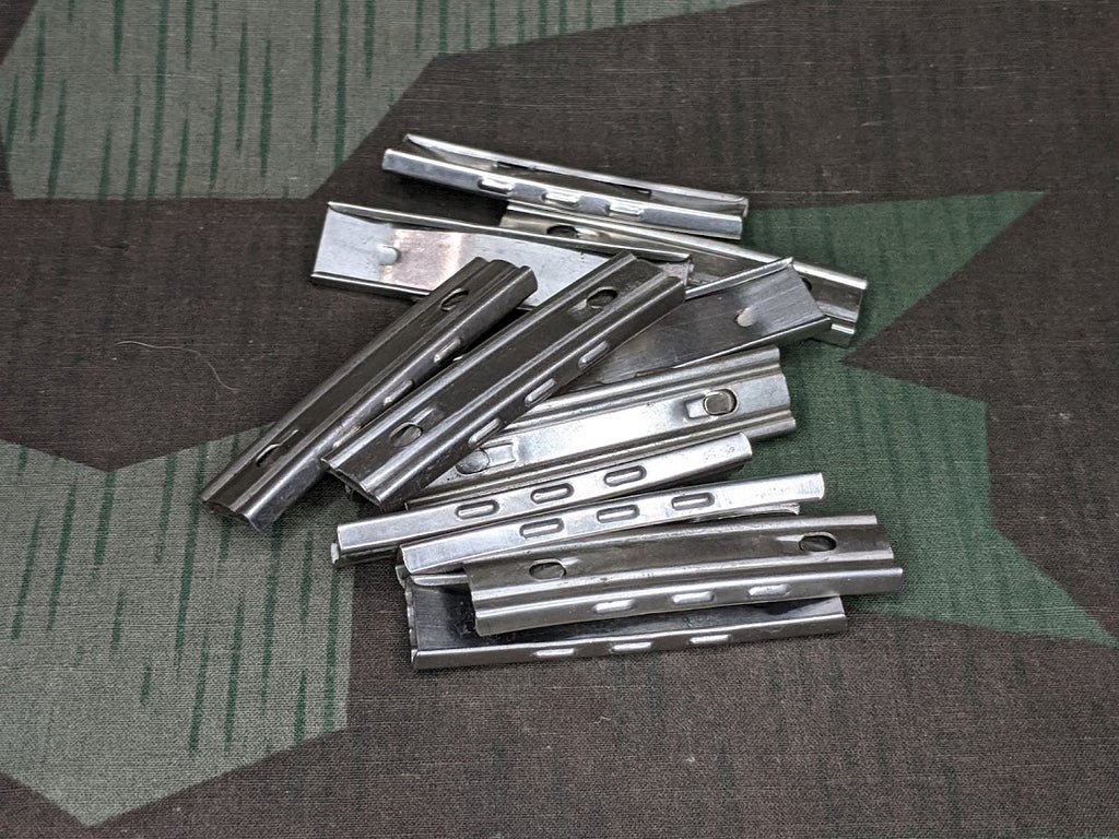 Post war 8mm mauser stripper clips in good condition. These do fit a k98 properly. These feed better than most of the brass clips out there.Clips fit five rounds.The price is foroneclip.