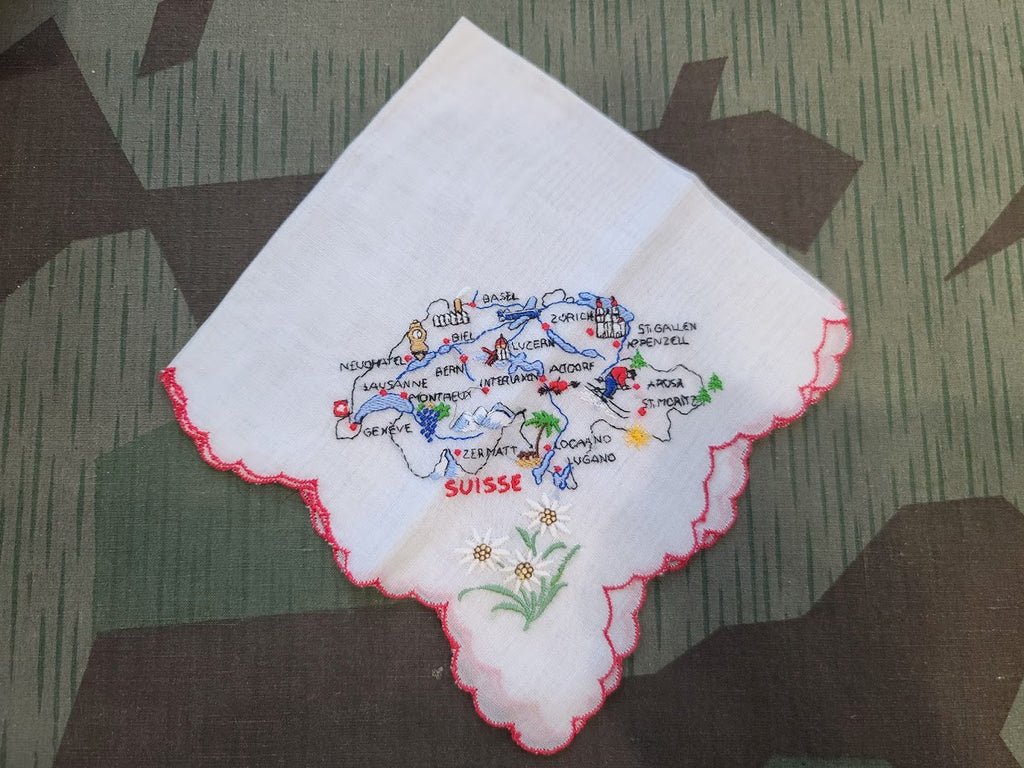 Vintage souvenir hankie from Switzerland with an embroidered map of the country and the edelweiss flowers. It is in overall good condition.