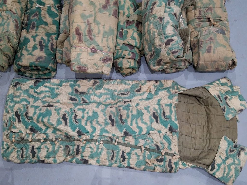 Limited quantity available. Fresh from a barn: dirty, dusty, stained, small holes, damage and repairs. These are Czech army sleeping bags produced in the early post war era. This is actually modeled off of the standard Red Army sleeping bag but with German inspired camouflage. A lot of German camo was recycled by the Czech army and they made stuff both from left over war time material as well as continuing to print certain patterns like this. Far more acceptable than a modern sleeping bag. I did not inspect every one or clean them. Some toggles may be missing or the loops that they would button through. They are very usable sleeping bags and very warm (I have had one for the past 15 years).You will need to clean thisbut you will be very happy with the sleeping bag when you use it. The colors of the camo do vary a bit, sorry no choice, see photos. The bag measures about 32' wide laid flat and the bag portion is about 60' or 5' tall plus there is a good bit above that.The bags are all generally in the same basic condition. I doubt any one bag is perfect. Despite their flaws, these are great sleeping bags and very hard to get these days. When they are gone, they are gone. I basically paid the same price for mine 15 years ago and have never regretted it. Price is for one sleeping bag.Ships for free inside the USA.