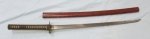 Original era manufacture. The polished steel blade measures 25 inches in length, on one side displaying a 6.5 inch carved dragon. The blade tang is plain on each side. The blade is clean, the point is sharp, with a very visible wavy temper line along the cutting edge. There is some scattered staining to the steel, with small spots of old cosmoline, telling us this was quite likely a WWII souvenir.Square shaped, iron tsuba with a cut-out decoration. Looks to be old original lacing on the grip, with gold decorated menuki within the lacing.Red lacquered wooden scabbard missing the loop on the side. The blade sticks a bit in the scabbard, no doubt due to the one-time cosmoline coating of the blade.