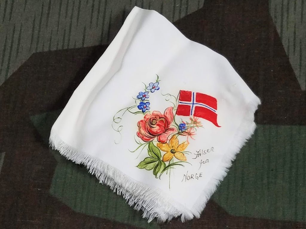 Vintage 'Hilsen fra Norge' (Greetings from Norway) silk (?) hankie. Painted design. Overall good condition. There are three small holes by the flag (two are from a staple) and one minor stain by the crease.
