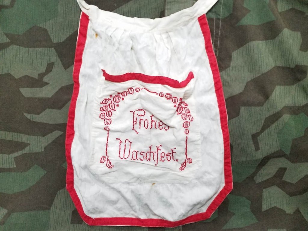 Vintage German 'Frohes Waschfest' (happy washing). This apron was designed to be used when doing laundry and hanging up clothing to dry. The large pocket on the front is for clothes pins. It is in OK condition. There are a lot of stains (rust?) and some loose stitching on the pocket.German clothing pins available here.