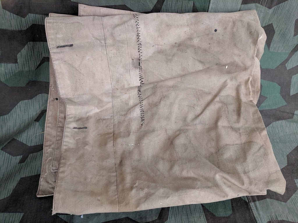 Stained and repaired Italian shelter quarter. It is a very heavily stained, faded, and soiled piece. Has rips, repairs and missing buttons. Would be a good ground cover or vehicle tarp.