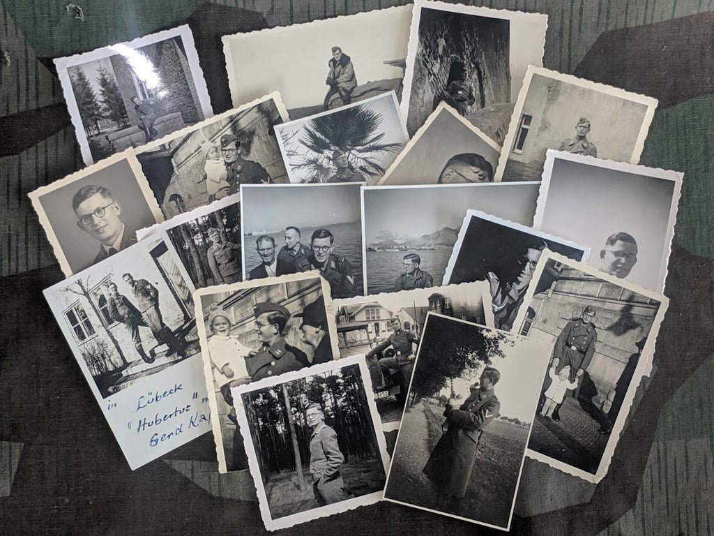 Collection of 19 WWII photos from a Luftwaffe soldier. We found these tucked inside a book and decided it best to keep them all together. A few photos have writing on the back. Several are dated 1940. You can see the soldier's rank changing as he gets promoted. Unfortunately we don't have any information on the man or even his name. The photos are all in generally good condition.