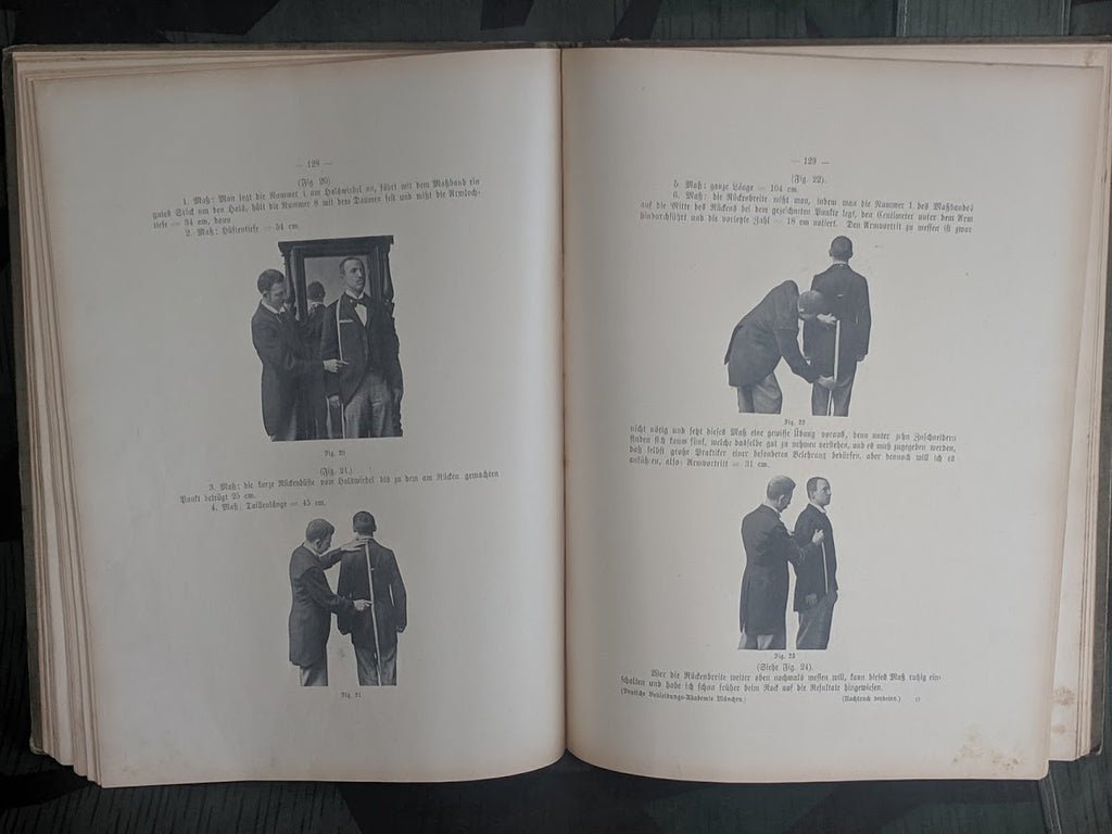 Very cool vintage German tailor's hand book from 1904. Lehrbuch der Zuschneidekunst. It shows how to make suits and other men's and boy's clothing and how to measure and basic patterns. There a a few ripped pages and some staining. overall decent shape and holding together. A must have reference book for someone looking to recreate or study clothing from this time period.