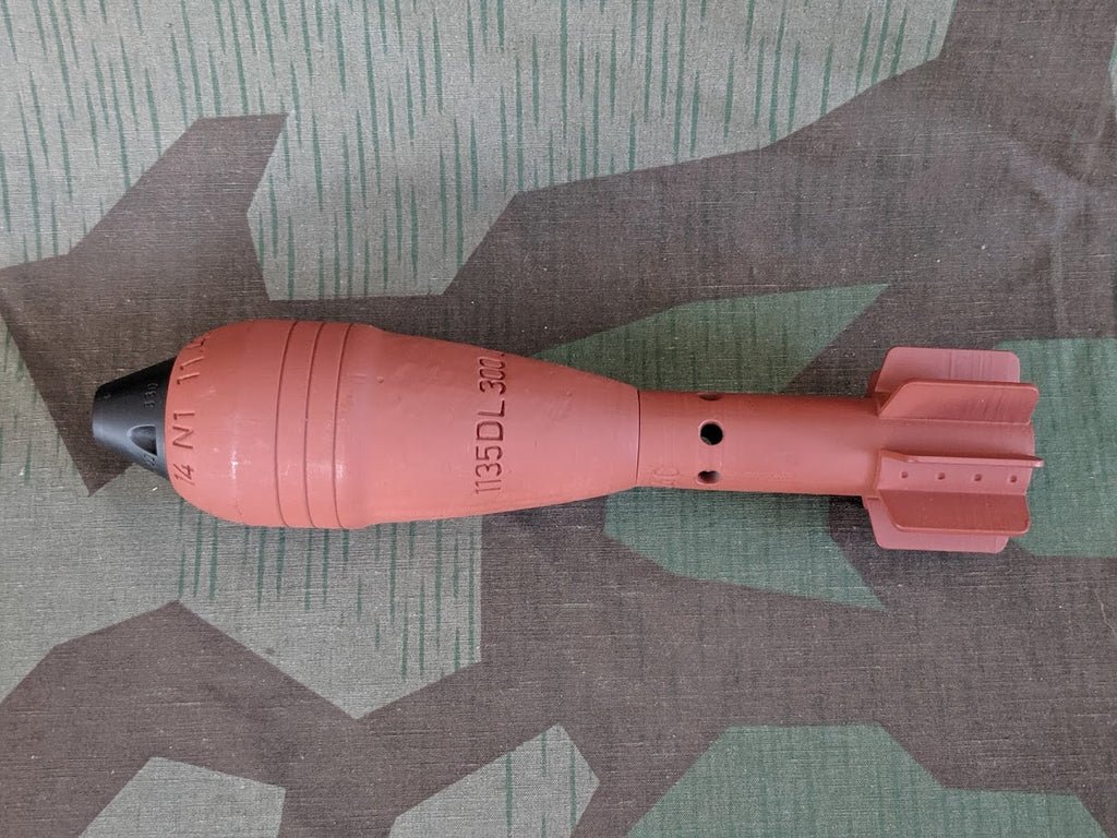 Reproduction 5cm mortar shell complete with reproduction black 'Bakelite' resin fuse. We also replicated the markings in the round while replacing the maker codes with our 3 letter code 'kem'. Very detailed reproduction down to the spot welds on the fins. The section of the round between the bourrelets and the tail section its a little rough and bumpy, as it should be. This is the perfect way to fill out a box for display. The round is entirely made from resin and is actually pretty strong. I threw one around the yard a bit and it took effort (and a speedy impact to concrete) to break. In testing, the fins were strong enough to resist breaking when squeezed tightly with fingers. These will stand up to a reasonable amount of abuse. All rounds are painted the correct primer red color. The rounds are hollow and light weight (less than 5 ounces).The price is for one round with fuse. May be shipped disassembled. The tail and fuse are separable.Made in USA