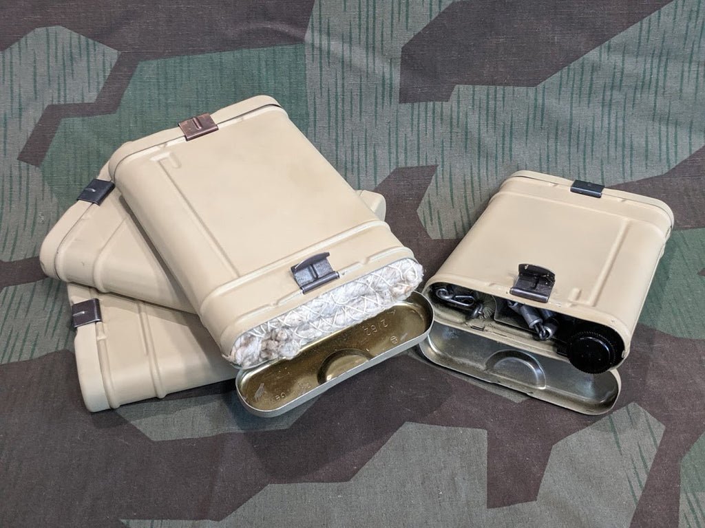 Reproduction RG34 (Reinigungsgerät 34) cleaning kits. These are post war manufactured cleaning kits that are the same model as WWII. Used for K98s and other weapons. The postwar paint has been stripped and postwar markings on the outside have be filled (the inside still has some markings). They are repainted in Ordinance Tan and a waffen amt has been added. Price is for one cleaning kit.The spoon isNOTincluded in the cleaning kits!