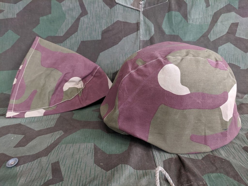 Reproductions of the Hungarian Camouflage helmet covers seen on German helmets in many photos of the fighting in and around Stalingrad. There has been much debate as to whether these covers were Amoeba or Hungarian and while the two have been frequently misidentified over the years, both can be found in original photos. Simple drawstring closure. These covers will fit up to a size 68 Shell.