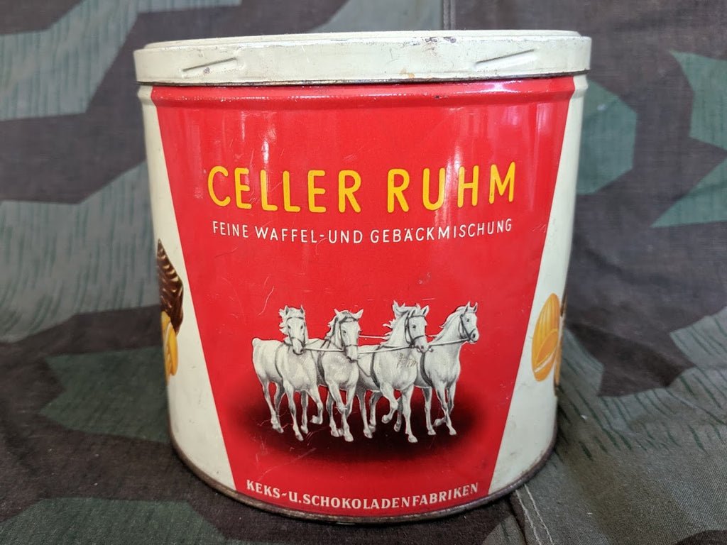 Trüller Celler Ruhm cookie (fine waffle and baked goods mix) tin. I am not as familiar with this brand, but this style of tin was introduced in 1933. This may be wartime or post war. It shows some wear and light rust and is a bit dirty. Would be a great tin to clean and refill.