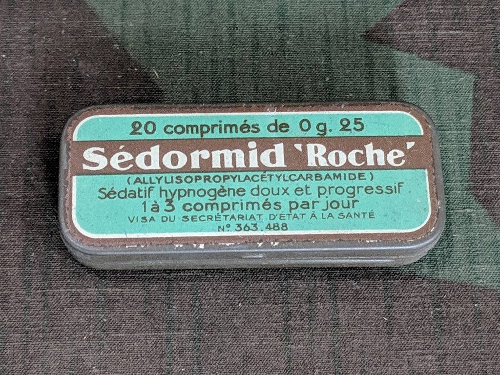Sedormid 'Roche' is a hypnotic/sedative drug synthesized in 1926 by Hoffmann-La Roche. Mainly used as a sleeping pill, but also for anxiety, nervousness, fatigue, and menstrual pain. It probably dates to the 1930s. (In 1935, they began to notice complications from the medicine). The tin is in good condition overall and still has the paper inside. It measures about 2 1/2' by 1 1/8'.