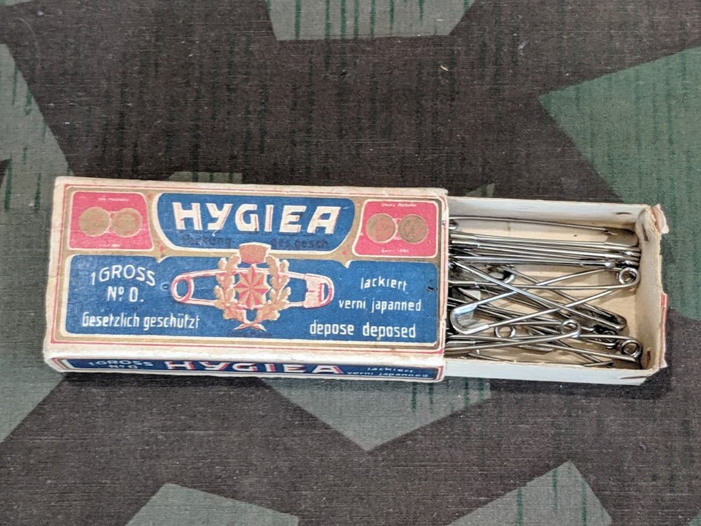 Vintage 1930s/1940s Hygiea safety pins in box. The box contains 20 pins. The pins are not original to the box, however they are vintage new old stock. The box says it originally contained 1 gross (144) of obviously smaller pins. The safety pins that come with the box currently measure just under 2' long. All of the pins are in good condition with no rust. The box shows wear and tear, writing on the bottom and the staples are rusty and loose on the inner portion.Wartime safety pins are different than modern pins in that one side of the end is a solid piece. They do not make safety pins like this any more or at least not that I can find; perfect for the detail-oriented reenactor.We have more safety pins (without a box) available here.