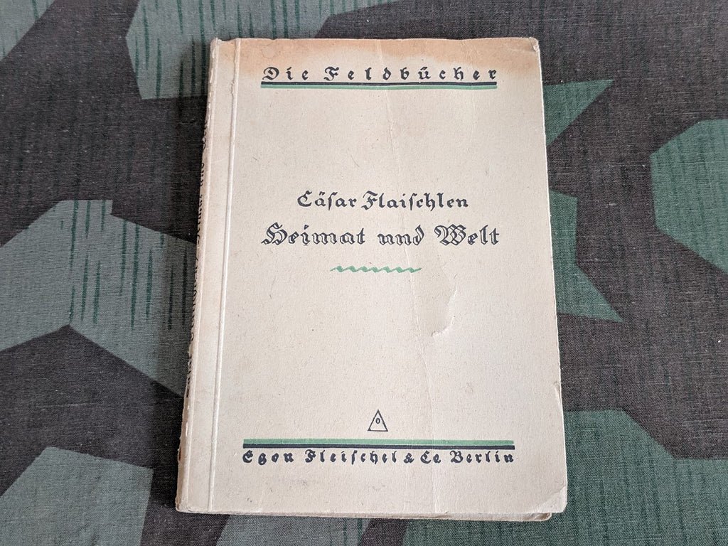 WWI Die FeldbĂŒcher Heimat und Welt book of poems byCĂ€sarFlaischlen. Printed in 1916. It has a very patriotic forward. The book is in fair condition. There is a large crease and a small tear on the cover. There is some discoloration and staining. The spin has come apart in the back. It measures about 6 1/4' by 4 3/8'.