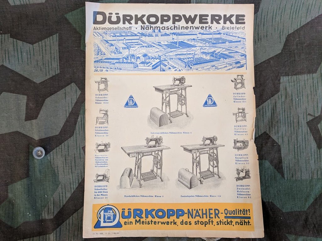Original Dürkoppwerke Nähmaschinenwerk advertisement papers for a sewing machine company. The front shows different sewing machines and the back show stands/desks for the sewing machines. Price is for ten pieces. They all show wear. They have some light water staining and discoloration. The edges may have small tears. Some have small creases in the corners. The paper is lightweight, similar to newsprint. They measure about 12 5/8' by 9 3/8'. May ship rolled up.