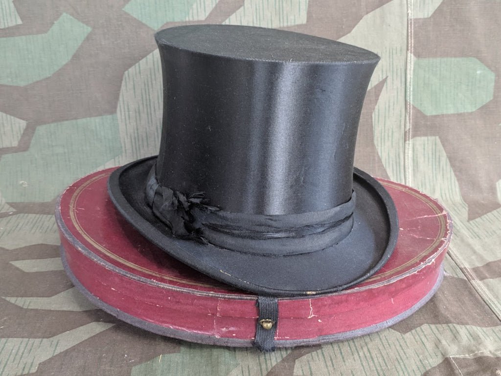 Pre-WWII French collapsible tophat and box. The top hat folds flat for easy carrying indoors. It is in decent, wearable condition, but does have a few issues. The outside band has some tearing and fraying. There are some spots of wear around the brim. The box also shows wear. The tophat is not original to the box, but fits decently. It is a small size, measuring 21' around the inside.Although the box stores the tophat flat, it is not ideal to store it in the closed position, as it puts added strain on the material.