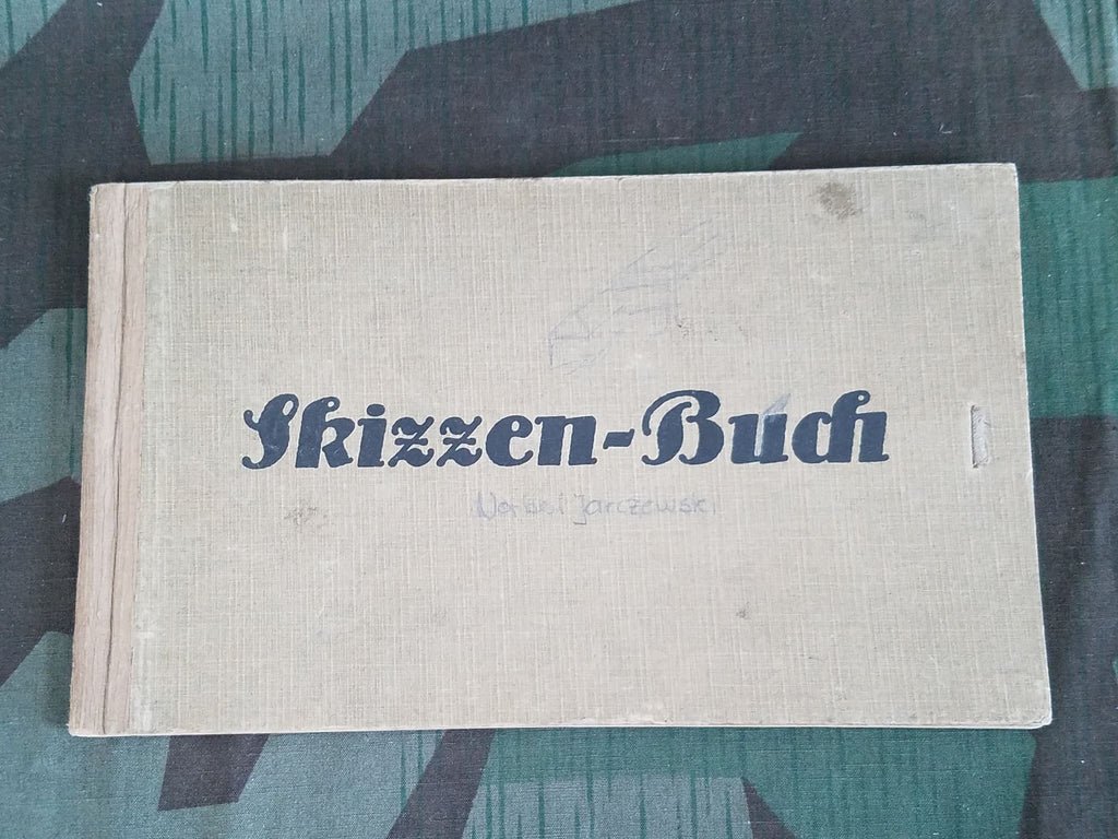 Vintage Skizzen-Buch sketch book. The name written on the cover looks Polish: Norbel Jarcƶewski. Inside, there is one sketch of an eagle. It is in decent condition. A few pages have been ripped out. It has some general wear and the staples are rusted. This is interesting as there was a fairly famous sketch book of this type which was reprinted and sold during the war because it had a number of war sketches in it. It is neat to see an actual sketch book of the same type. It measures about 9' by 5 1/4'.