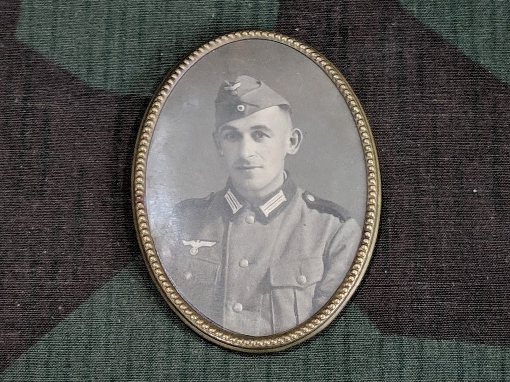 Original pocket mirror with photo of a soldier. Overall good condition. There is some cloudiness and age-related wear along the outside of the mirror and some small specks. It measures about 2 3/4' by 2'