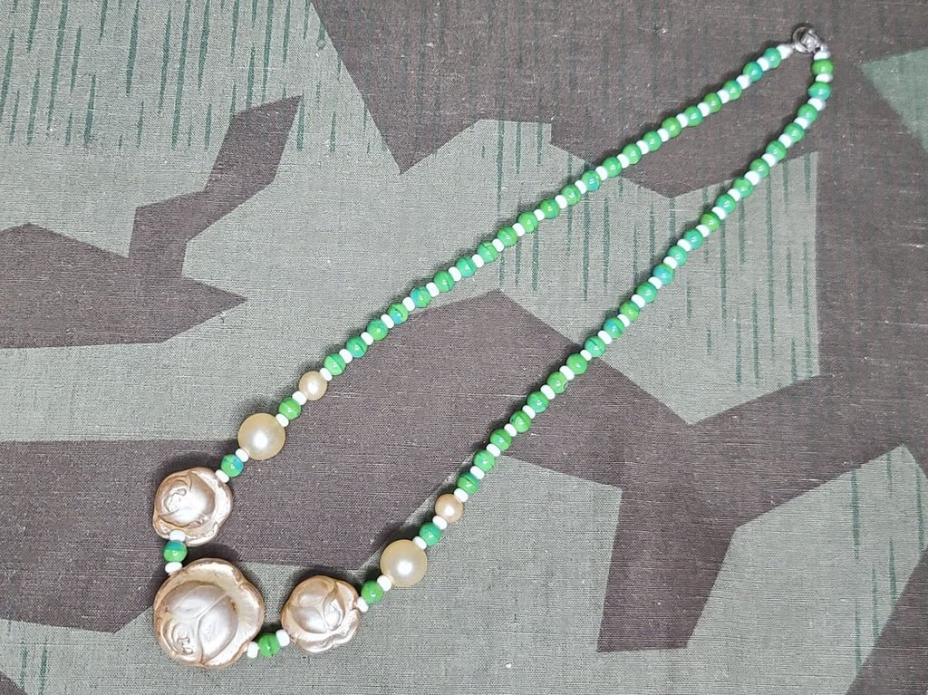 Vintage 1920s /1930s green glass bead necklace from Germany with nice rose beads. It isin good, wearable condition although it is original dead stock (the store closed before the war) so if it is pulled hard, the string could break.Be gentle when handling it and it should hold up. The clasp seems like it wouldn't stay closed very well.The finish on some of the rose shaped beads has flaked off. The necklace measures about 17'.Price is for one. They originally came tied together with old newspaper.We have more glass necklaces from the same place available in theJewelry Section.