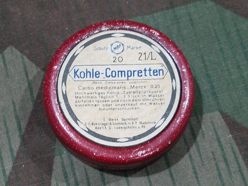 Original Kohle Compretten tin for charcoal tablets to be dissolved in water and drank. They are supposed to help digestion and prevent illness. It is in decent condition; there is some wear to the finish, scratches and small dents. The inside is fairly clean. It measures about 2' in diameter.