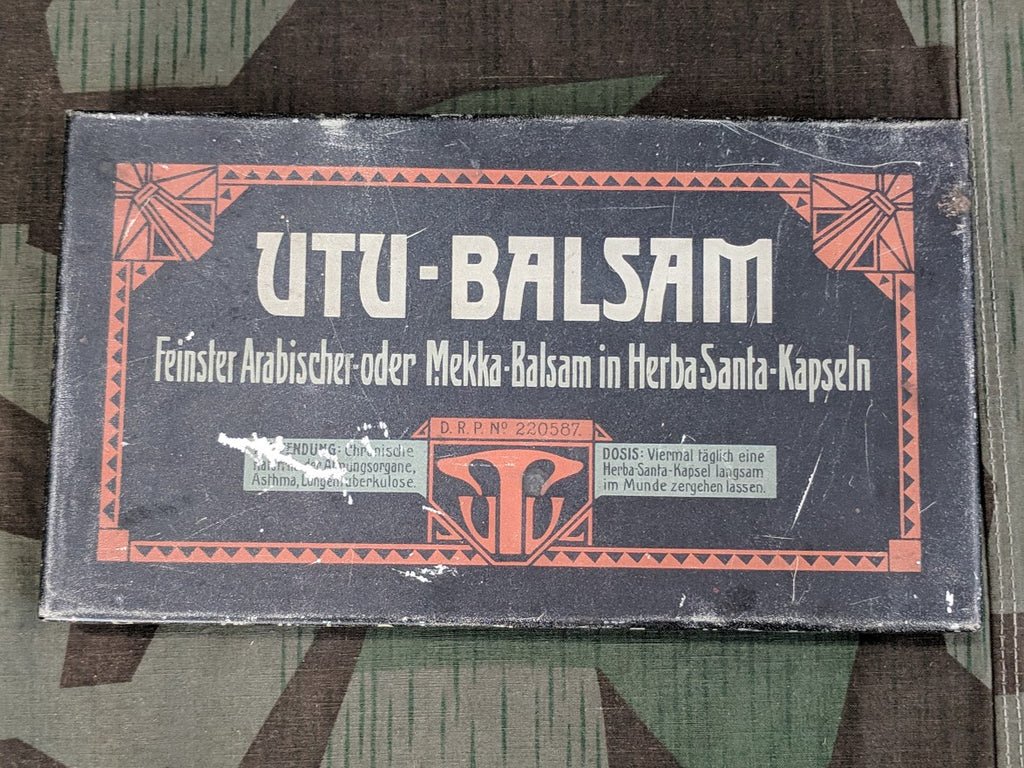 Vintage probably WWI era or 1920s large Utu-Balsam container. D.R.P. marked. The container was originally for medicine, a lozenge for cough, sore throat, and general health. It is in decent condition with some wear (scratches and light rust). It measures 9 1/8' by 5 1/8'.