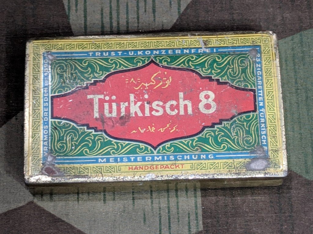 Pre war Türkisch 8 cigarette tin. Trust- U. Konzernfrei Meistermischung Handgepackt. It is in OK condition. There is wear to the finish, light rust and scratches. It measures about 4 1/2 by 2 7/8'.