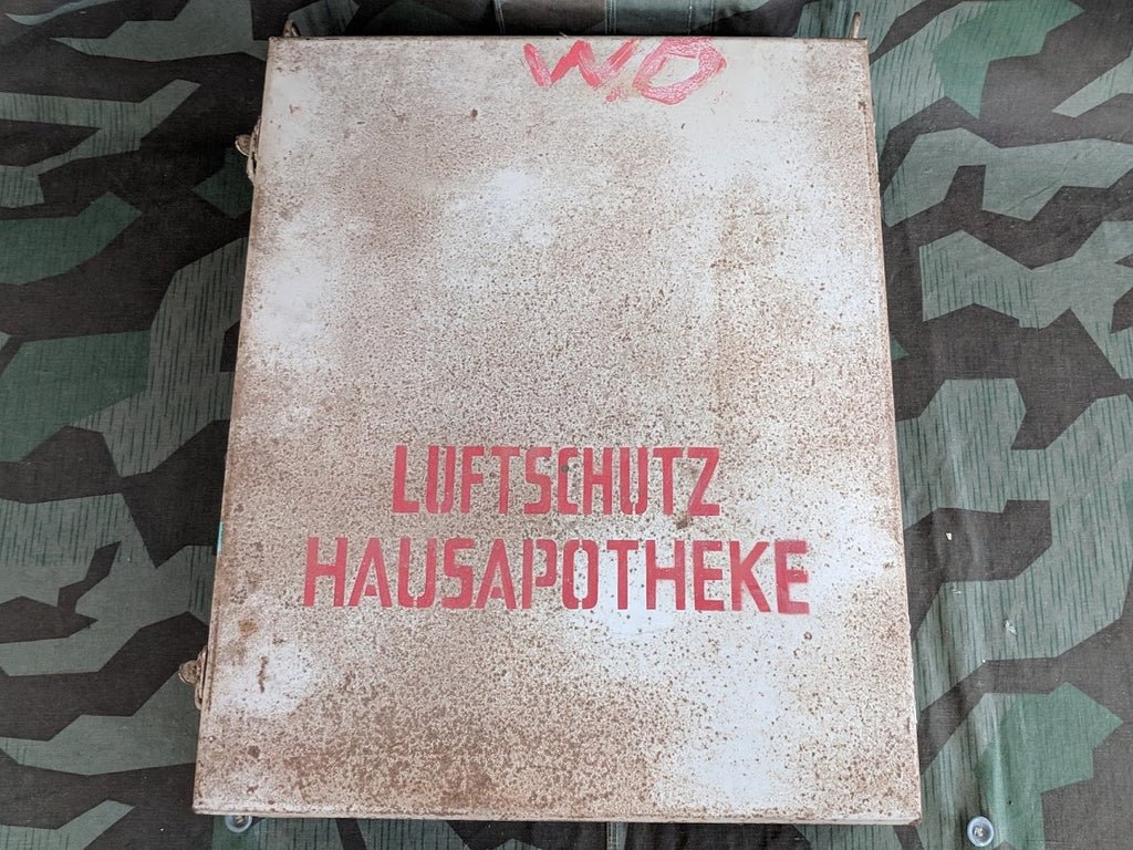 This is a nice Luftschutz Apotheke air raid first aid medicine cabinet. The outside is in decent condition with light surface rust. It retains a lot of its original paint; someone painted WD on the front. The inside is pretty clean with just some gunk/rust on the bottom shelf.This cabinet has been hanging in my house for a while and used as an actual medicine cabinet. I recently replaced it with a slightly cleaner one so it is time to move this along. These are great medicine cabinets and a great way to hang the hobby on the wall at home that even normal people (non collectors) will enjoy.