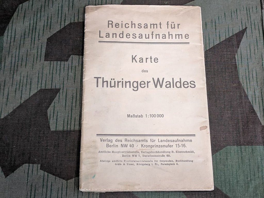 Hiking map of the Thüringer Waldes. It is stained but otherwise OK. There are some tears on the creases. Folded up, it measures about 8 3/4' by 5 5/8'.