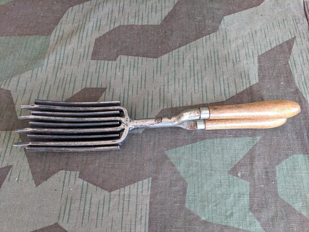 Vintage German 1920s/1930s hair waving iron. It is metal with a wooden handle. To use, it would be heated on the stove before applying to the hair. It does show wear and needs a cleaning. There is also a little rust. It measures 10' long.