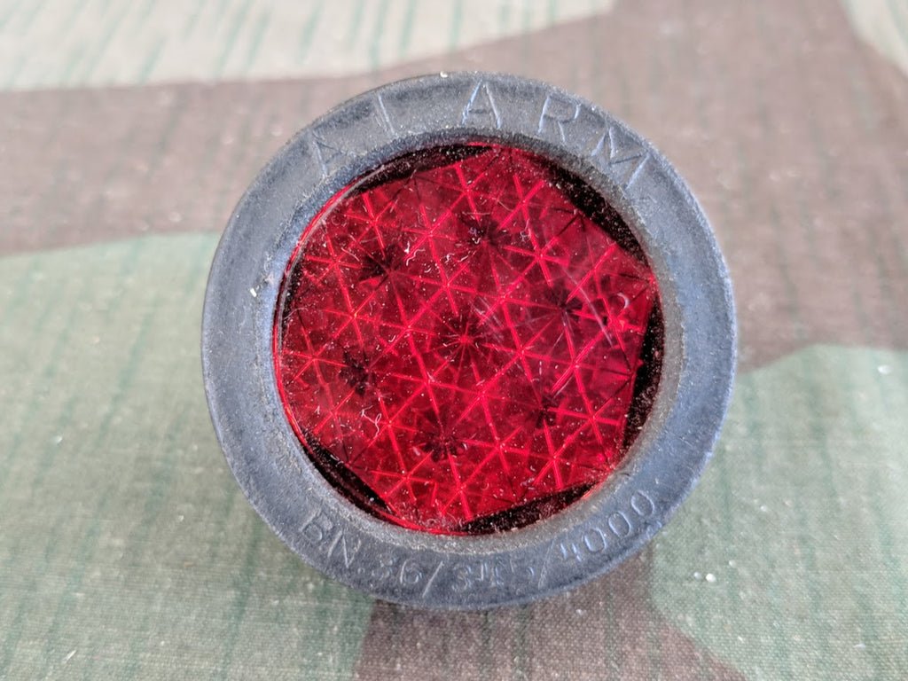 Glass bicycle reflector. It is marked Alarm B.N. 36/345/4000. There are some scratches on the glass. It is made from very hard rubber. I am unsure of its exact age. Ready to mount on a fender. It measures a little under 2' in diameter.