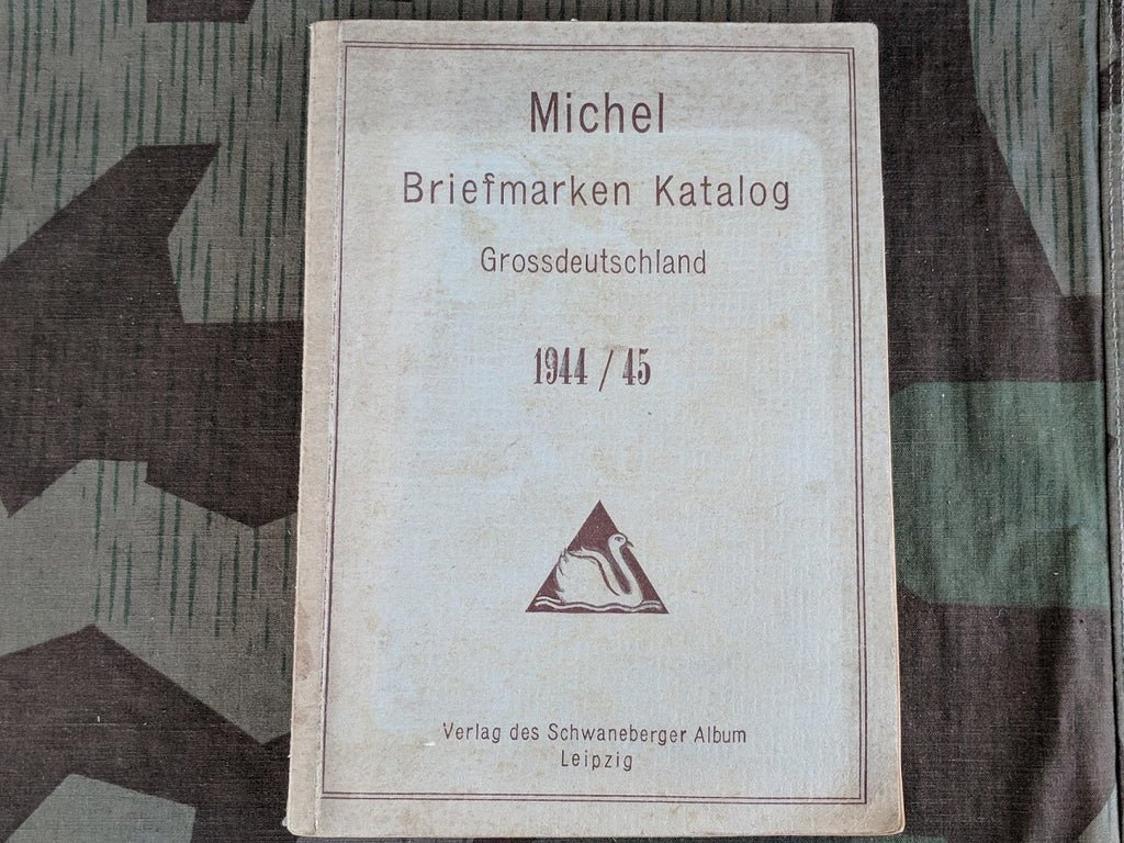 1944/45 Michel Briefmarken Katalog postage stamp catalog. It has stamps from the 1800s up until 1944. The forward is dated May 1944. It seems to be something of a collectors reference book. There is a swan drawn in pencil on the title page. It also has some discoloration and warping. A few pages have small tears. It is still holding together well and very usable. A great resource with a wealth of information. It measures about 8 1/4' by 6'