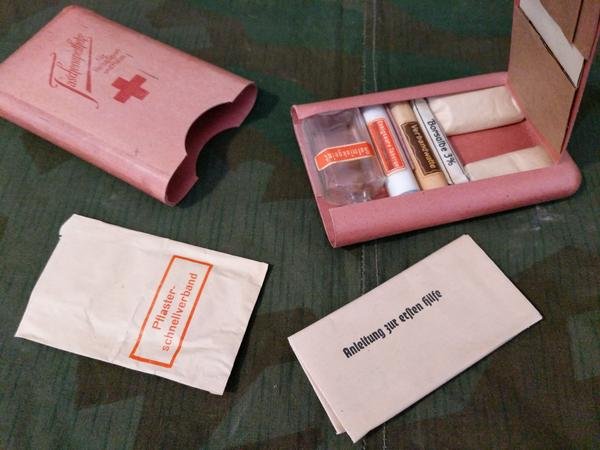 Pre-war Taschenapotheke first aid kit in case made from pressed paper. For travel, sport and house. It is nearly complete and in good condition. It measures 6' by 3 1/2'.