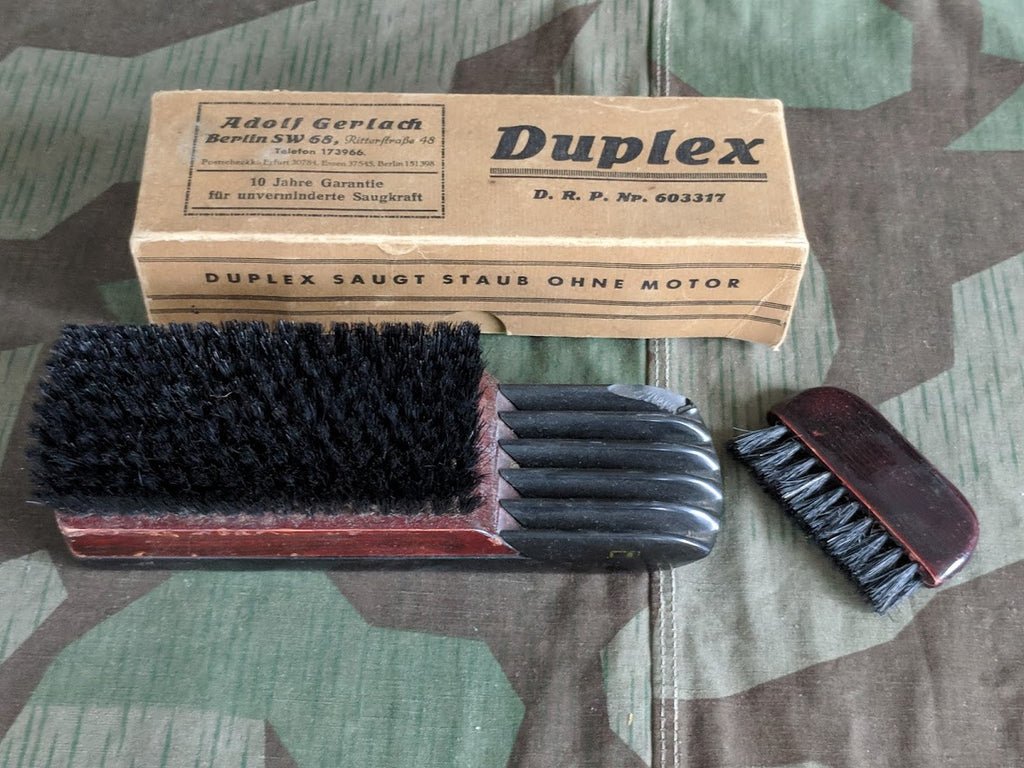 Original Duplex-DRP clothing brush set in box. Sucks dirt without a motor (Saugt Staub ohne Motor). The box and the larger brush are marked DRP (Deutsches Reichspatent).It uses static to collect dust, but it also has some traditional brushes. Both brushes are in fair condition. There is a chip on the larger one and a lot of wear to the finish one both of them.The box is nice with light age related wear. The box measures about 7 3/4' by 2 1/2' by 1 7/8'.