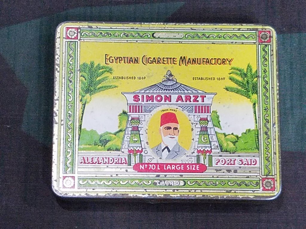 Period Simon Arzt cigarette tin. This was a Jewish owned company out of Egypt. I am not sure if it is pre-war from the 1930s or post-war 1950s. The shiny area on the bottom is where the tax seal was. The tin is in decent condition; there are some rust spots and small indents. It measures about 4 1/8' x 3 3/8'.