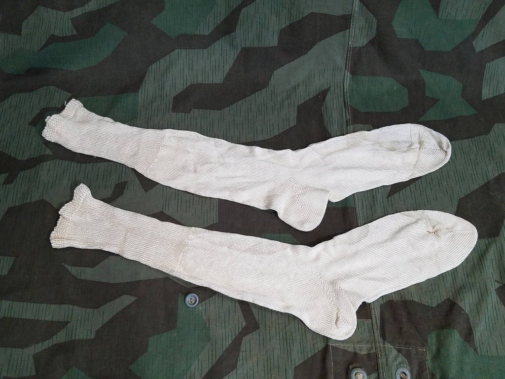 German socks from around WWII, they closely match other civilian socks we have had from the mid 30's, though we know similar materials and techniques were still being used after the war. They are all roughly a men's US shoe size 11 to 12.The foot measures about 11 1/2' long . They are about 16' tall.Price is for one pair.They are from a factory clean out and are new old stock. Some may have storage wear, such as pulls in the material or water damage (they worst is pictured) and may need cleaned. Socks of this pattern were also sold in the officers clothing catalog. Great personal item. It can be difficult to find decent men's footwear and socks this old.Hand wash, hang dry.