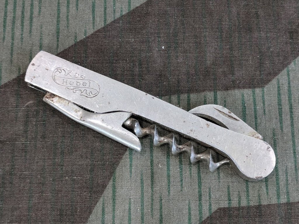 German Hebel corkscrew and bottle opener tool. The construction is simple and durable. I have seen the Hebel name before on original items so it is likely roughly from the WWII period but could be pre or post war. Hebel does mean lever in German but it seems to have also been the name of a manufacturer. It needs a cleaning but otherwise in good usable condition. It measures about 4 3/8' long.