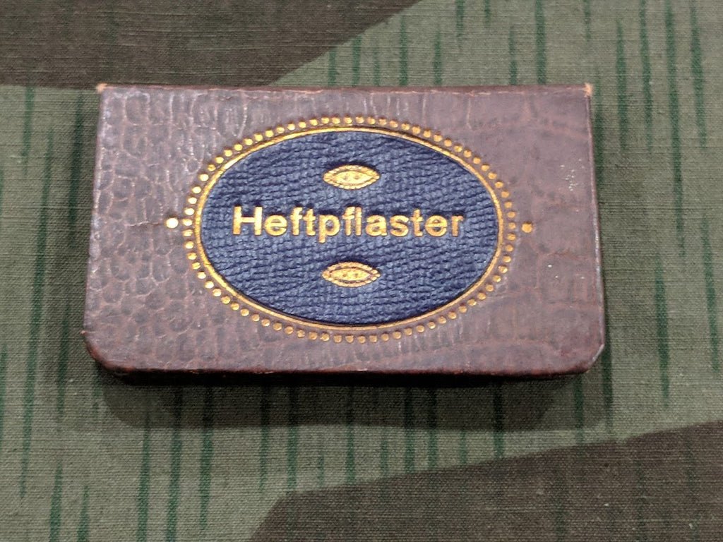 Heftplaster adhesive bandage holder. The literal translation is sticking plaster. Unfortunately, it is too small for the normal standard band-aid size (although it would fit the slightly sizes). It is in decent condition, with some wear along the edges. It measures 2 7/8' by 1 3/4'.