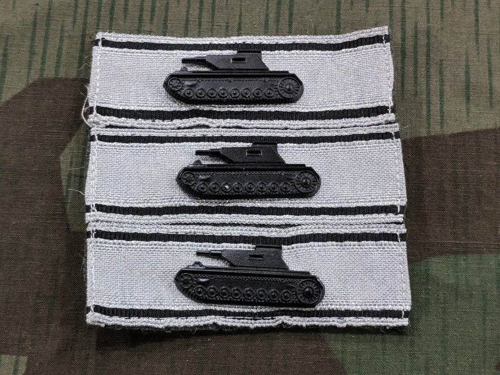 In March 9 1942, the tank destruction badge was created to award to individuals who had single-handedly knocked out an enemy armored vehicle using a handheld weapon. Anti-tank units were not eligible to receive the award. Prior to the creation of this badge, soldiers would have been awarded a general assault badge. The tank destruction badge in silver was awarded once for each vehicle destroyed.These are attached to a feldgrau wool backing. The price is for one badge. If you order more than one, I will try to leave them connected to make attaching them a little easier if it is possible.This is the best looking reproduction I have seen, which is why I chose to stock it. I have avoided medals for a long time simply because the quality just wasn't there until now.