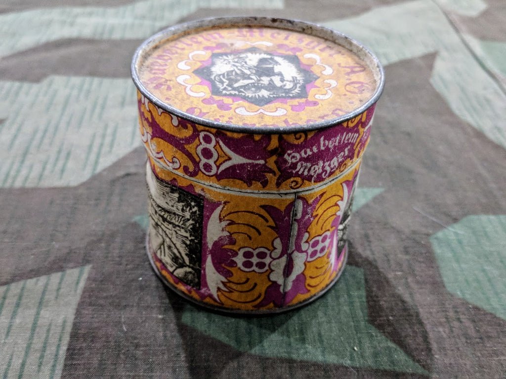 Very small Nuernberger Lebkuchen tin. Lebkuchen is a popular German gingerbread type cookie with various coatings, which were frequently shipped to the front around Christmas time. It is in OK condition with several dents and some wear to the finish. Most of the lebkuchen tins we come across are much larger. I believe this is an older example maybe even appropriate for WWI. It measures about 2 3/4' in diameter by 2 5/8' tall.