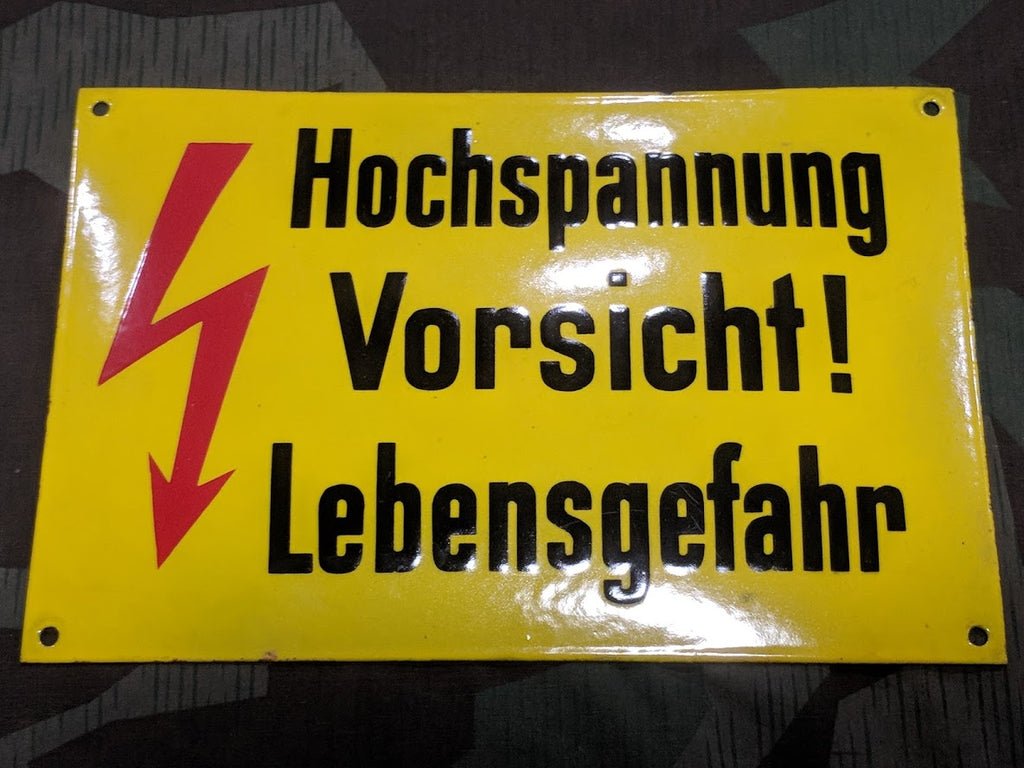 Hochspannung Vorsicht! Lebensgefahr ('High Voltage Caution! Life Danger') enamel electrical sign. It would look great above your circuit breaker panel!The manufacture of this sign looks older like signs made in the 30's but it could also be early post war. The lettering is raised like older signs. It is in good condition with light wear and minimal rust on the back. No chips or cracks that I can see. It is likely unused dead stock. It measures about 11 3/4' by 7 3/4'.