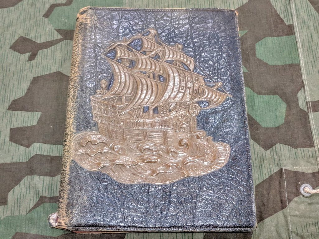Original pre-WWII German leather desk blotter embossed with a ship. The embossing is very deep. The condition is a little rough but it actually looks like it was lightly used at most. There are some pen scribbles on one of the folder pages probably from someone testing or trying to get their pen to flow. It has a locking compartment and still has its key. The outer cover is in decent condition with the most wear near the spine. Inside, some of the paper pieces are rough and peeling away from the cover and the edges of the folder section are rough. Clean this up a bit and it will leave quite an impression. Closed, it measures about 15 1/2' x 11 1/4'.