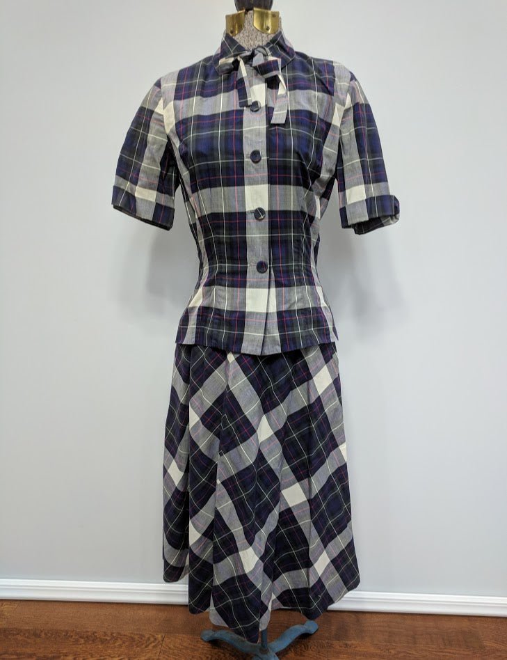 Vintage 1930s / 1940s plaid matching outfit, blouse and skirt.MEASUREMENTS (approximate):BLOUSE:Bust- 35'Waist- 25'Length- 22.5'SKIRT:Waist- 24'Hips- 36'Length- 28.75'The short sleeve blouse has fabric covered buttons and a tie at the neck, The label inside reads 'Tailored by McMullen exclusively for the M. O'Neil Company.' There is also a size 10 label inside (note: a vintage size 10 is much smaller than a modern size 10, please refer to the measurements listed above). The neck has snaps inside the collar. The skirt has pockets! The skirt has a metal side zipper, hook and eye and snap closures.The set is in overall good condition. There are some small pulls on the material. It also has a few spots of very light yellowing (not noticeable unless you really look closely) and couple very small brown specks.