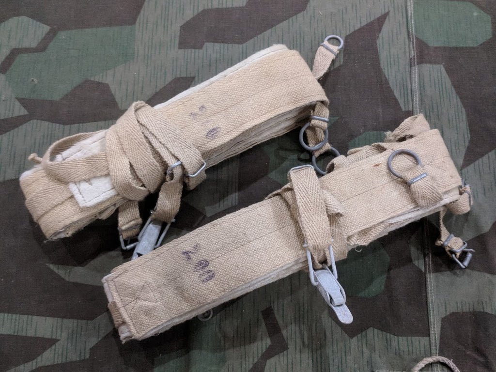 Original WWII vet bring back German ski skins made from artificial seal fur for skis 200cm long. The fur is directional allowing the ski to glide forward across the snow and then grip in the other direction. If you were using skies in the German army you would have had these with you. This is essentially how you are able to climb the slope on skies (Bergauf, uphill). All are in good unissued condition with a little dirt from storage. The coated steel parts have light oxidation.Price is for ONE SET.