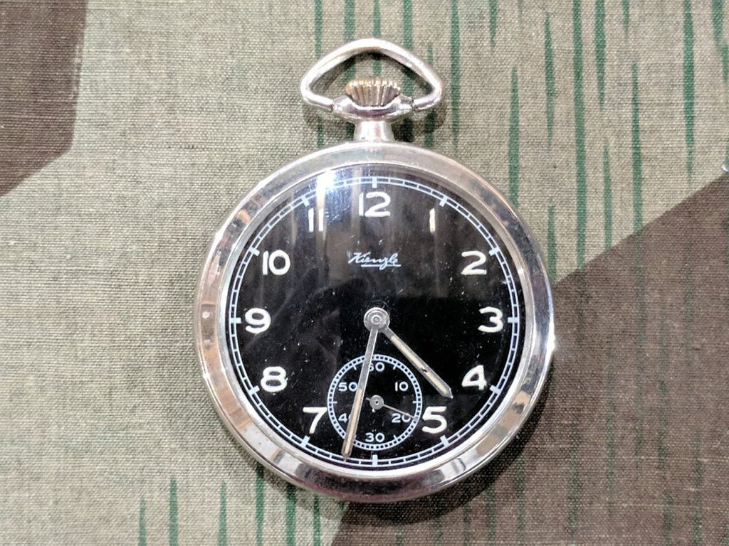 This is a nice period Kienzle pocket watch with a nice style black face that gives it a good military look. It shows some light wear but the watch is running and is very usable. I believe it might be a touch slow, I have fiddled with it a bit, but this is the best I could get it without getting too in depth.This one was probably made right after the war, but it is the same style as war time. Almost nothing changed in the style of these watches from the 30's till well after the war. Kienzle is one of the few actual German-made watches and they were very popular, as they were less expensive than their Swiss made counterparts. This is more of an every mans watch (the period version of Timex).Note for handling watches:Do not shake a watch! If it seems to be sticking rotate it back and forth a bit as if you were turning a knob off and on; this motion works in the same direction as the movement.Never fully wind a watch! Wind the watch only until you feel slightly more resistance. If it stops turning you've gone too far. You probably didn't damage it this time, but don't do it again. A better habit is to simply wind it a little bit throughout the day.Generally speaking as long as a watch still runs, its probably still good. If a watch is a little slow or fast it can probably be adjusted with little effort. A watch maker can do it quickly with a tool timing tool but it can also be done with trial and error. Very often a small adjustment to the +/- leaver inside the watch will make a big difference to the speed.