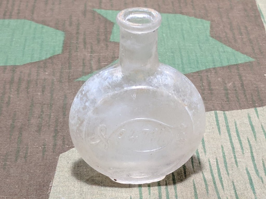 WWI era 4711 small cologne bottle. This would have been closed with a cork. It is in OK condition, showing wear and age. There are some small chips in the glass on the bottom. The glass is a little cloudy. This was dug from a sort of Victorian era landfill near Berlin. It measures 3' tall and 2 1/4' at the widest.