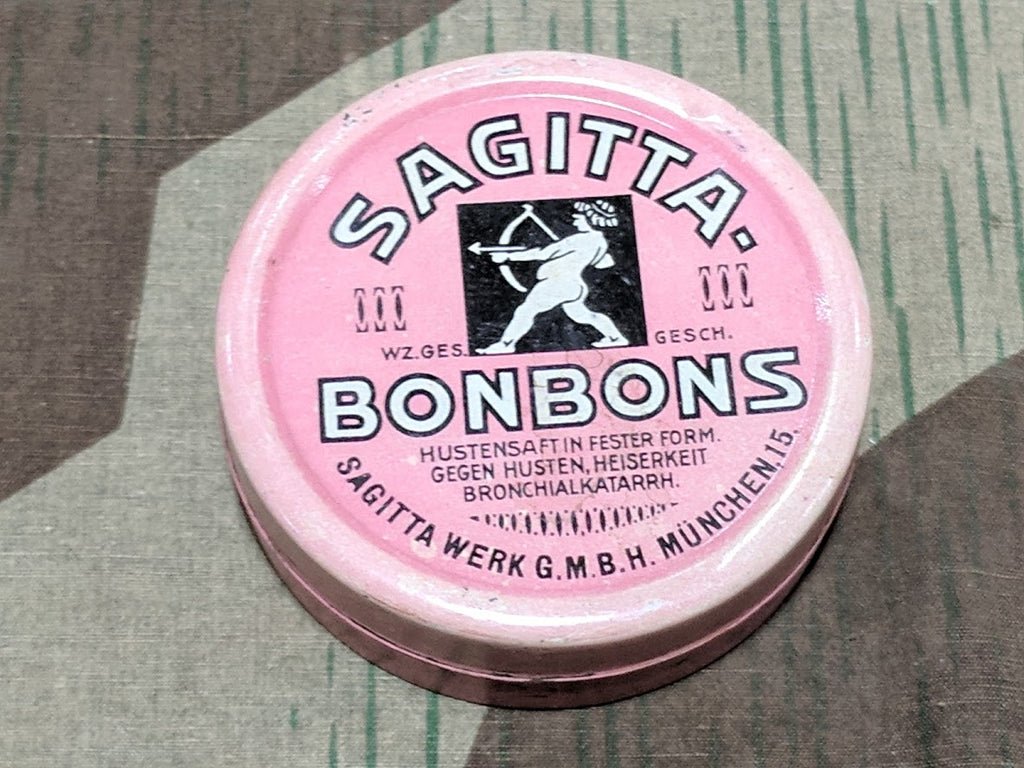 Original 1930's Sagitta-bonbons tin. These were basically cough drops. Take 1 or 2 bonbons every hour, let them dissolve in your mouth, do not chew. Give children half as much. It is fairly clean inside. The outside has some discoloration. All in all, a decent example. It measures about 3' in diameter.