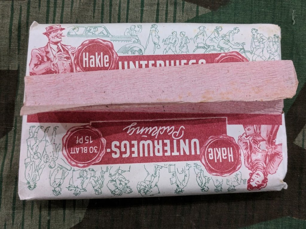 Original Hakle Unterwegs-packung travel package toilet paper. It is a crepe paper and each package supposedly contains 30 pieces. These are new old stock but some may have light damage and/or staining from improper storage. Price is for one. They measure about 5' x 3 3/8'.