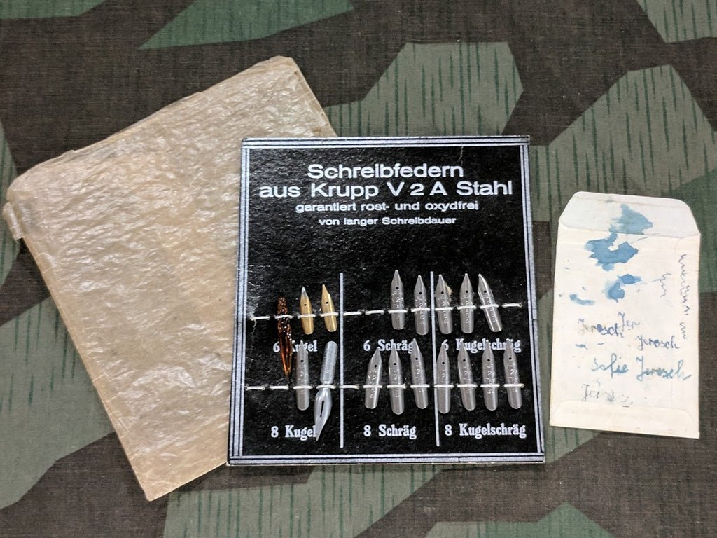 Period German pen nibs on card. Most of the nibs are made from Krupp V2 A Stahl. Krupp is better known for cannons. There is also a glass pen nib and a Pelikan ink advertising envelope with some ink staining on it. Unfortunately, the card is missing several nibs but overall it is still a nice piece. The card measures about 5' by 5 1/2'.
